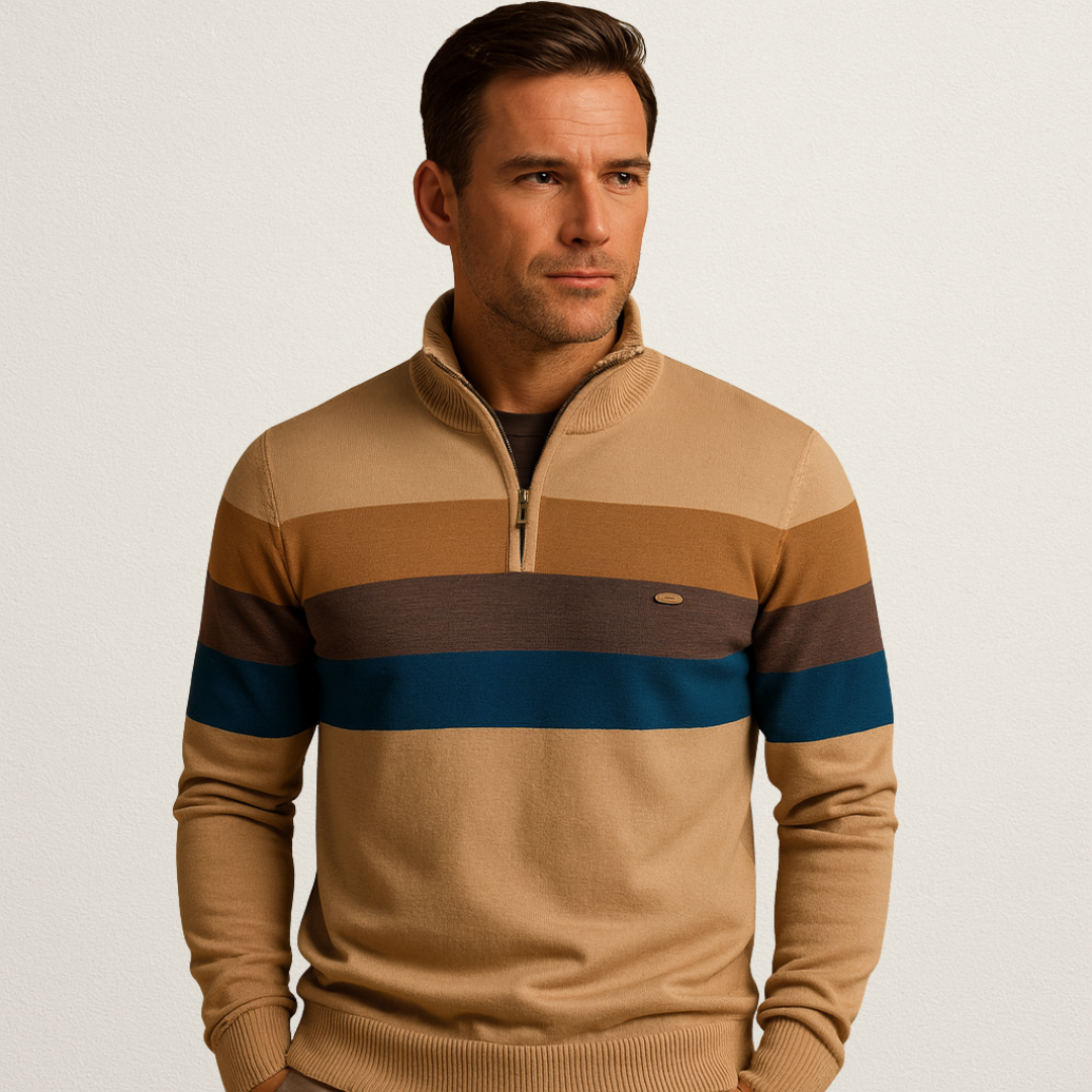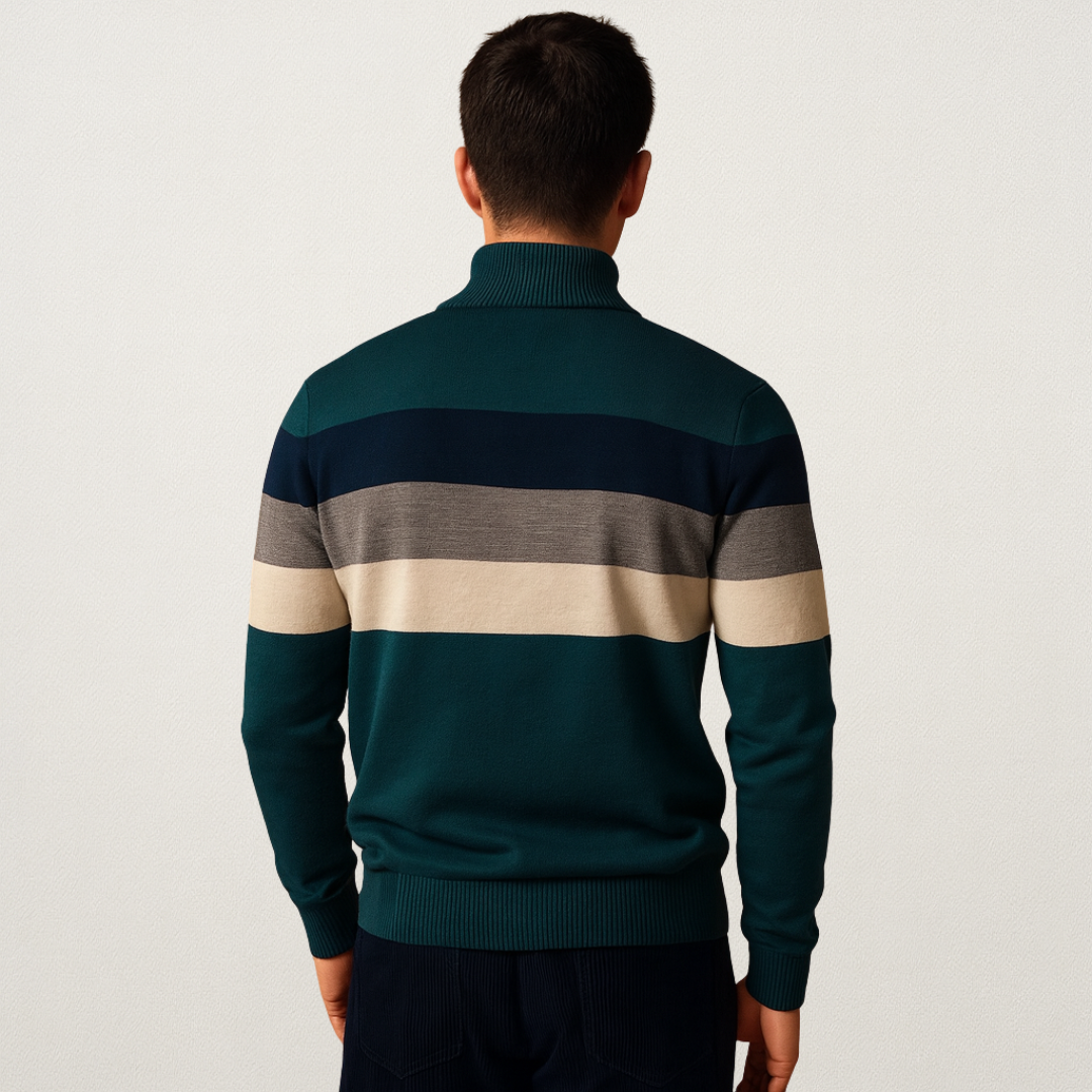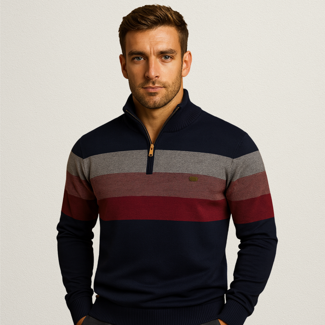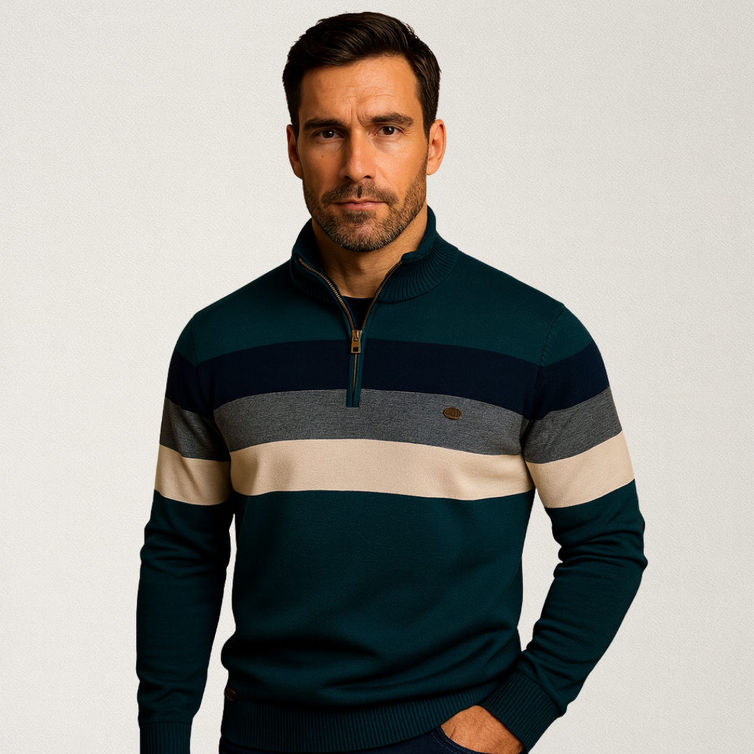 Ten męski sweter w paski z półsuwakiem łączy klasyczne wzornictwo z codzienną wygodą. Charakterystyczny kołnierzyk i pasiaste wykończenie nadają stylizacji świeżego, uporządkowanego wyglądu. To warstwa, po którą łatwo sięgnąć w ciągu tygodnia, idealna do luźnych i bardziej dopracowanych outfitów.